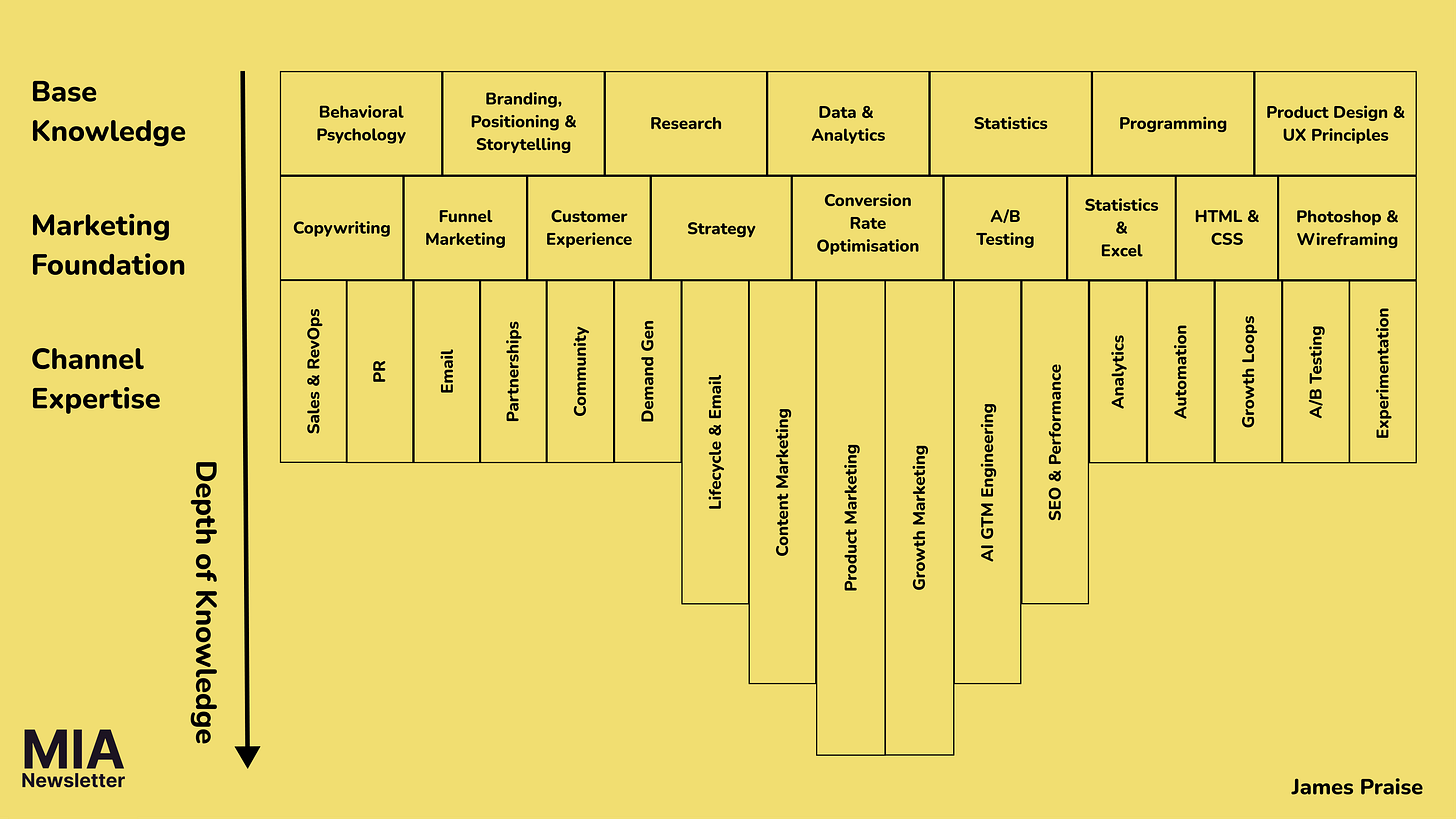 Be a T, M or π-shaped marketer. Get the base knowledge, and marketing foundations, and then dive deep into specific channels.